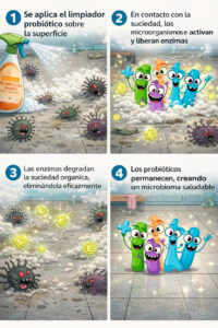 A diferencia de los productos tradicionales, que actúan únicamente en el momento de la aplicación, los limpiadores probióticos mantienen microorganismos beneficiosos activos en las superficies. Estos microorganismos liberan enzimas de forma continua que degradan la materia orgánica residual y evitan la reaparición de la suciedad.